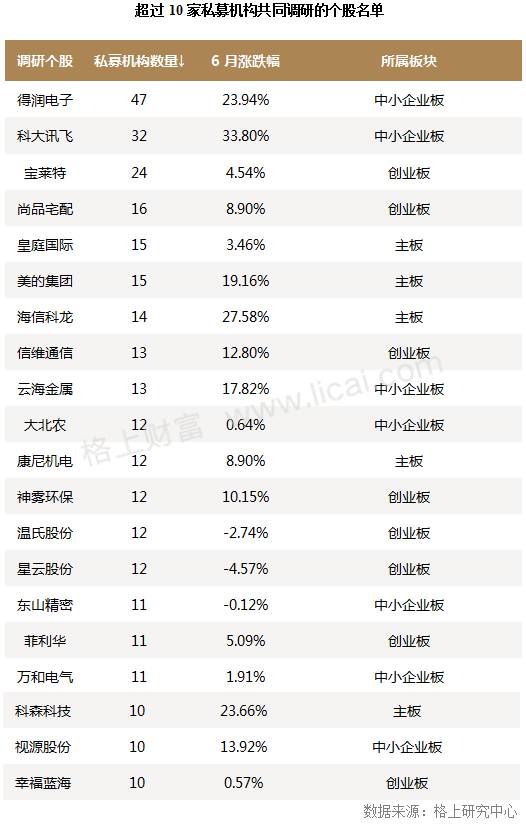 此外,格上研究中心发现,6月私募共同调研个股涨幅最大的是“科大讯飞”,单月上涨33.80%;“得润电子”受到最高关注,月度调研次数为47家,该个股6月涨幅为23.94%,涨势也较为迅猛。这两只个股同属于中小板,且均有人工智能概念。
