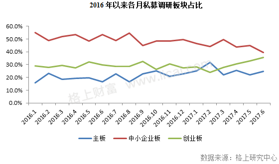 格上研究中心发现,从今年2月份开始,私募对创业板的关注度屡创新高,截至6月份创业板的关注度增至35.59%,创2016年以来新高。与之相对应的是,中小板关注度则一路下滑,从2016年初的55.0%至本月跌破40%,主板关注度在则较上月微涨2.74个百分点,达24.77%。