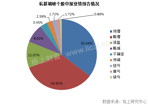 行业方面,电子、机械设备行业仍是私募调研个股关注度最高的两大板块,而对于百亿级私募,公共事业行业的关注度却较为突出。格上研究中心注意到,私募调研的222只个股中,有116只已经公布了中报业绩预告,占比52.25%。在预告中报业绩的私募调研个股中,大部分属于中报业绩预喜状态,占比达82.75%。其中,有35.34%的公司预计业绩增长,33.62%预计略增,12.07%续盈。可见,私募机构对中报行情的关注。
