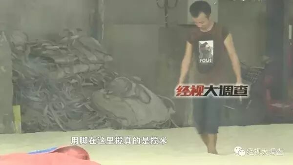 湖南长沙雨花区的一处仓库门口,曾晾晒着大量大米,这些大米平铺在地上,面积足有两三百平米。长沙食药监局联合湖南经视发现,有工厂工人光脚在米里走过,米的高度没过了脚踝,这些米已经受潮。