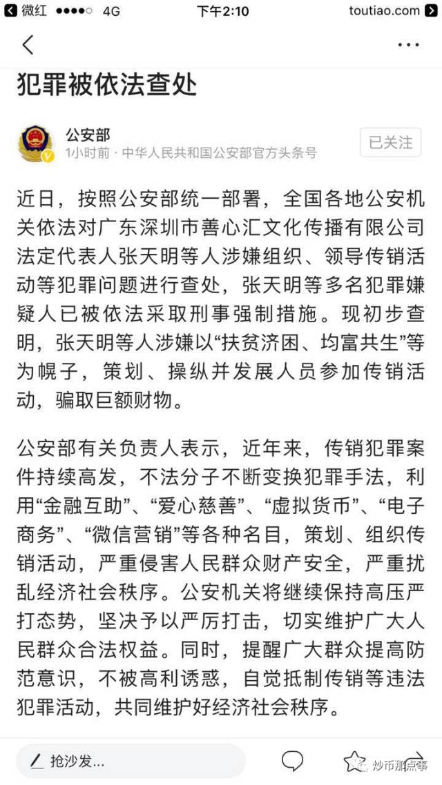 7月21日,公安部官网发布消息称,善心汇公司张天明等人涉嫌传销等犯罪被依法查处。