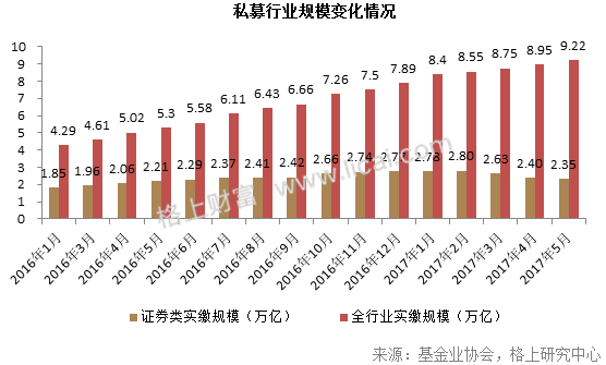 截止5月底,私募行业认缴规模达12.79万亿,实缴规模达9.22万亿元,其中证券类实缴规模为2.35万亿元。虽然整个行业的规模在不断增长,但证券类私募管理人的规模却自2月开始出现不断减小,下降幅度达16.07%。其主要原因在于,基金业协会在2017年3月调整了统计口径,此前是直接根据基金类型统计数量及规模,调整后改为对于同一私募基金管理人管理不同类型私募基金的,产品规模按其所属私募基金管理人的机构类型归类统计。