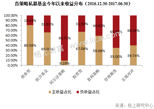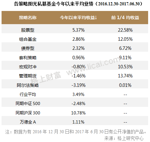 从整个私募行业来看,据格上研究中心统计,上半年私募行业平均收益为3.49%,其中股票策略今年以来表现最佳,收益达5.37%,而宏观对冲、管理期货和阿尔法策略收益为负,其余策略获得正收益。