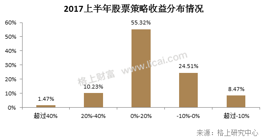 今年上半年,A股市场“漂亮50”和“夺命3000”的分化行情记忆尤新,一些价值投资的私募基金抓住机遇在上半年取得了较好的收益。据格上研究中心统计,股票策略有67.06%的私募基金在上半年获得正收益,有1.47%的产品涨幅超过40%,收益为0%-20%的基金占比最多,高达55.32%。