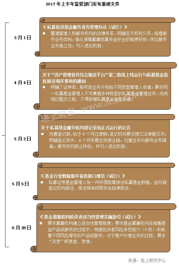 2017年上半年,中国基金业协会陆续发布一系列私募监管的重磅文件。格上研究中心认为, 从2016年的规范元年到现在,私募行业正在迈向更加规范、透明的未来。