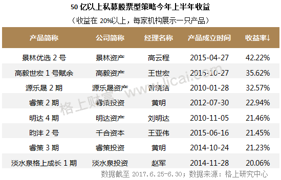 格上研究中心数据显示,截至到目前披露数据的私募产品中,共有318只股票型私募产品收益在20%以上,其中50亿以上私募机构旗下产品包揽了105只,其中不乏景林资产、高毅资产、淡水泉投资等价值派投资机构。