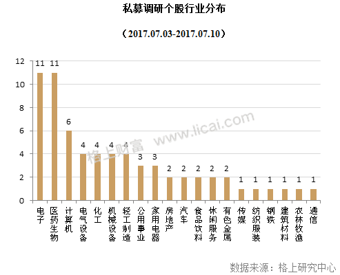 据格上研究中心统计,在私募机构调研的个股中,本周对中小企业板的关注度仍旧最高为46.97%,而创业板和主板的关注度分别为25.76%和27.27%。行业方面,电子和医药生物为本周私募关注焦点,均有11家上市公司接受调研。
