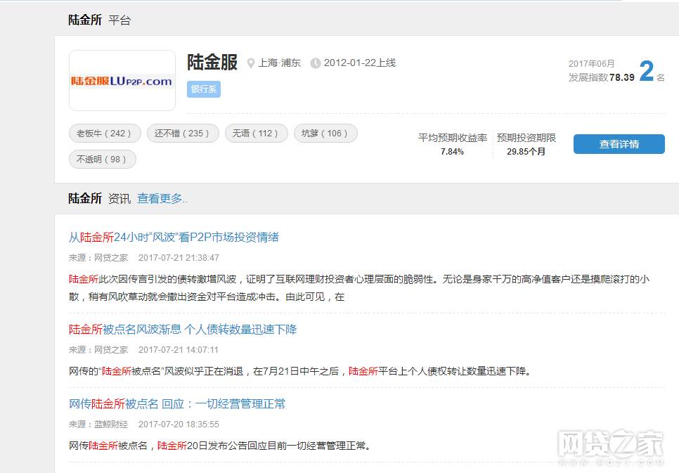 从上图你能查到信息有陆金所的利息,口碑,近期重大事件,上线时期,行业排名,平台背景等。