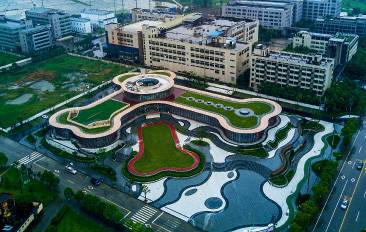 6月21日,空中俯瞰平阳县“宠物小镇客厅”。该建筑是以宠物狗喜欢的骨头作为样式设计的。浙江省温州市平阳县“宠物小镇客厅”具有咨询、导游、展示宣传等功能,可以让游客通过多媒体技术了解宠物种类、历史、习性,还能进行游戏互动。有“中国皮都”之称的平阳县水头镇,通过产业转型升级,主推附加值高、污染小的宠物产业,建成时尚产业类的特色小镇。图/新华