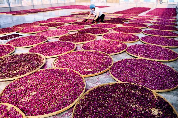 5月17日,山东省即墨市灵山镇“玫瑰小镇”产业园的农民在加工玫瑰花茶。图/中新