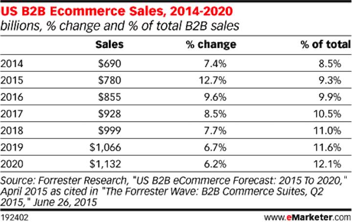 (北美 B2B 市场规模将逐年增长,图片来源:eMarketer)