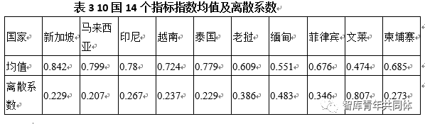 另外,以上五国的各分项指标之间相对比较均衡。为衡量东盟成员国各个三级指标的均衡程度,可比较各国14个指标的指数之间的离散程度,指数越离散表明越不均衡,反之越均衡。一般而言,当进行离散程度比较时,如果两组数据的度量单位与平均数相同,可直接利用标准差来比较。但是如果单位和(或)平均数不同时,则需采用离散系数来比较(翟崑、王丽娜,2016)。离散系数常用CV表示,CV=σ/μ,σ是该组数据的标准差,μ是均值。根据公式,本文计算了每个国家14个指标指数的离散系数,如表3所示。可知:以上五国的离散系数均小于0.3,且均值比较大,表明五国的贸易建设状况总体来看比较均衡,各指标间均衡发展。