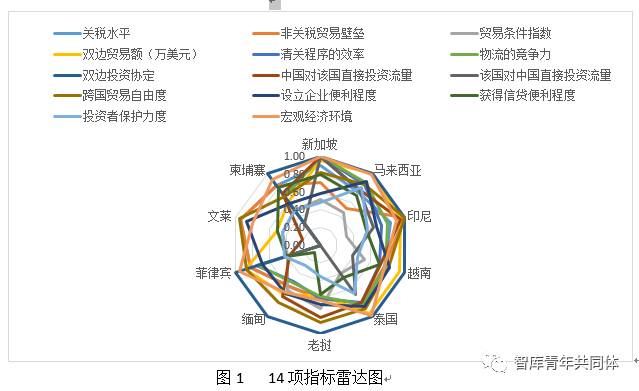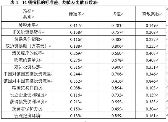 第四,总体来看,中国与东盟间贸易畅通情况良好,但投资水平及营商环境仍存在改善空间。为此本文计算了14项指标的标准差、均值及离散系数(表4)及绘制了雷达图(图1),以便更好地对总体状况进行描述。均值越大,表明该指标整体水平越高;离散系数越小,说明各东盟国家在这个指标上差异性越小。呈现出三个特点:(1)关税水平、跨国贸易自由度、宏观经济环境三个指标均值较大,离散系数小,表明中国与东盟各国间关税水平较低,跨国贸易自由度较高,宏观经济环境各国总体较好。关税水平均值为0.783,处于较高水平,这说明随着多双边机制的建立,东盟地区的关税已大幅下降,但是中老及中缅仍然存在关税下降的空间。事实上,关税对国际贸易的阻碍作用依然存在。随着各国关税水平的普遍降低和区域经济合作的深化,关税对国际贸易的影响逐渐减小,但是仍存在一定的阻碍作用(孔庆峰,2015)。(2)“该国对中国直接投资流量”指标均值较小,离散系数最大,这表明各国间对中国直接投资流量存在较大差异。2015年老挝、缅甸对中国投资额近乎为0,而新加坡对中国投资额为58亿美元,继续保持中国吸收外商直接投资第一大来源国地位;中国对新加坡投资额为50亿美元,双边往来投资额基本相当。(3)非关税壁垒比较严重,影响双边贸易额的扩大。从非关税壁垒指数来看,十国平均值为0.757,较低于关税水平指标。尤其是马来西亚、老挝和缅甸三国的双边壁垒仍比较严重,低于0.6。