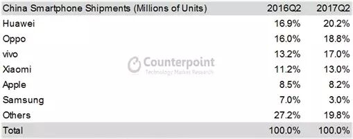 中国智能手机2016和2017年第二季度出货量对比图。数据来源:Counterpoint