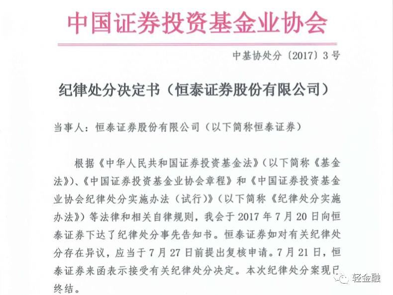 根据《中华人民共和国证券投资基金法》(以下简称《基金法》)、《中国证券投资基金业协会章程》和《中国证券投资基金业协会纪律处分实施办法(试行)》(以下简称《纪律处分实施办法》)等法律和相关自律规则,我会于2017年7月20日向恒泰证券下达了纪律处分事先告知书。恒泰证券如对有关纪律处分存在异议,应当于7月27日前提出复核申请。7月21日,恒泰证券来函表示接受有关纪律处分决定。本次纪律处分案现已终结。