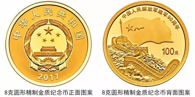 8克圆形金质纪念币背面图案为军旗、长城造型组合设计,并刊“中国人民解放军建军90周年”字样及面额。 纪念币含纯金8克,直径22毫米,面额100元,成色99.9%,最大发行量30000枚。
