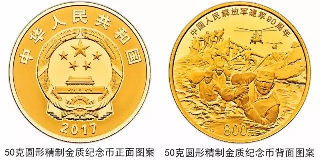50克圆形金质纪念币背面图案为解放军官兵和武警官兵抢险救灾场景,并刊“中国人民解放军建军90周年”字样及面额。 纪念币含纯金50克,直径40毫米,面额800元,成色99.9%,最大发行量2000枚。