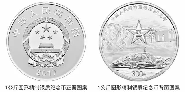 1公斤圆形银质纪念币背面图案为八一军徽配以井冈山、延安宝塔山、西柏坡典型造型组合设计,并刊“中国人民解放军建军90周年”字样及面额。 纪念币含纯银1公斤,直径100毫米,面额300元,成色99.9%,最大发行量3000枚。