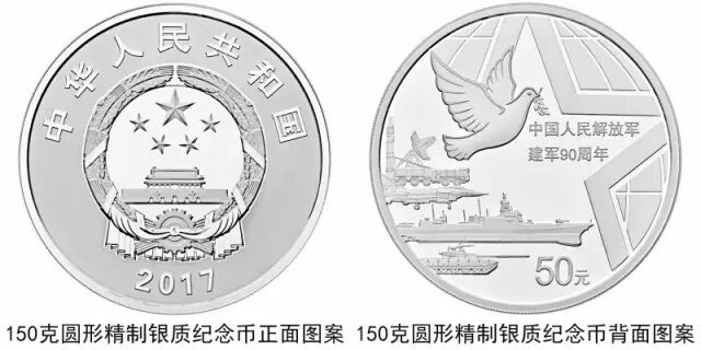 150克圆形银质纪念币背面图案为陆军、海军、空军、火箭军、战略支援部队典型武器装备以及地球、和平鸽图形等组合设计,并刊“中国人民解放军建军90周年”字样及面额。 纪念币含纯银150克,直径70毫米,面额50元,成色99.9%,最大发行量9000枚。