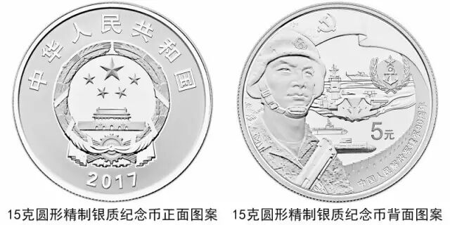 15克圆形银质纪念币背面图案之二为党旗下的海军军人形象配以典型武器装备、军兵种臂章图案、长城造型等组合设计,并刊“中国人民解放军建军90周年”字样及面额。