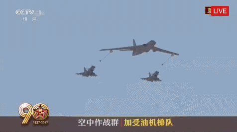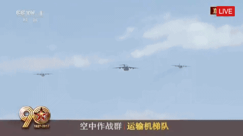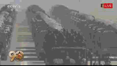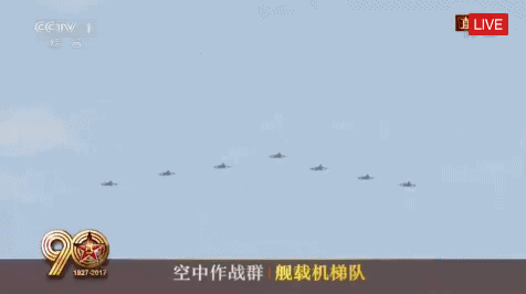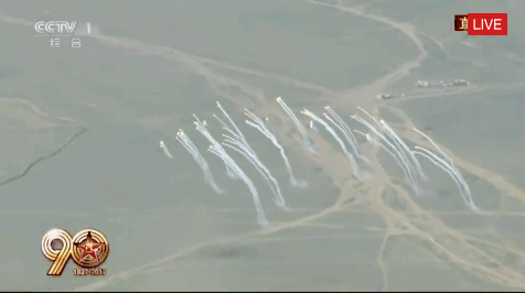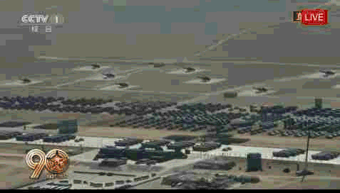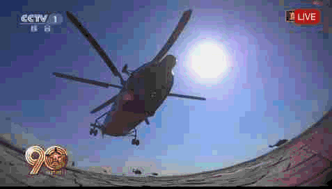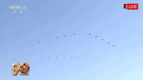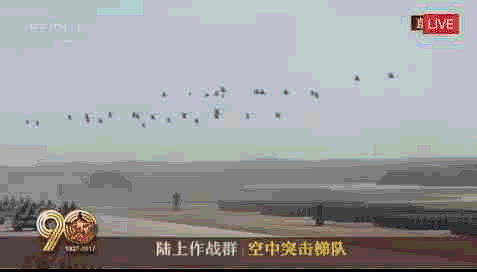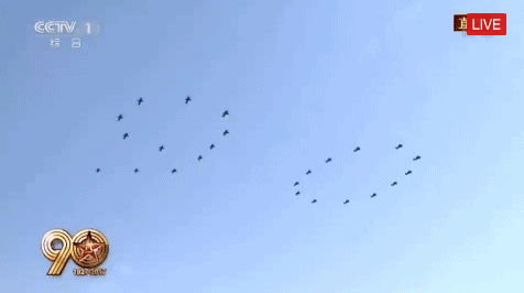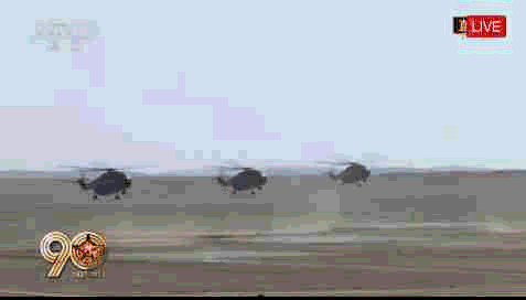 17架直升机组成“八一”标识,24架直升机绘出“90”字样,象征着人民军队走过了90年光辉历程。
