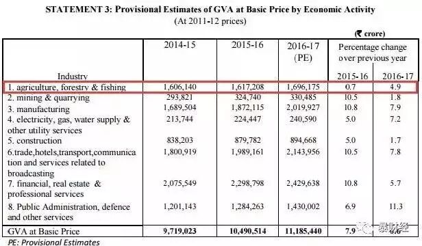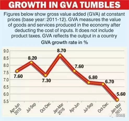 按照印度调整GDP算法之前常用的GVA测算,以2011年到2012年的价格为基准(修改算法前印度是以2004~2005年的价格为GVA的计算基准),印度经济增长的模样是这样的:仅为5.6%。(注:GVA是一种衡量经济增长的方式,和GDP的差别主要在于不计入产品税和生产补贴)