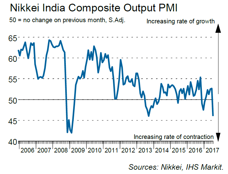 这些数据表明,这个亚洲第三大的世界新兴经济体经济状况可能十分脆弱。有分析称,由于消费税改革导致国内供给链和分销链出现紊乱,印度的商业情况极度恶化,达到金融危机以来最糟糕水平。