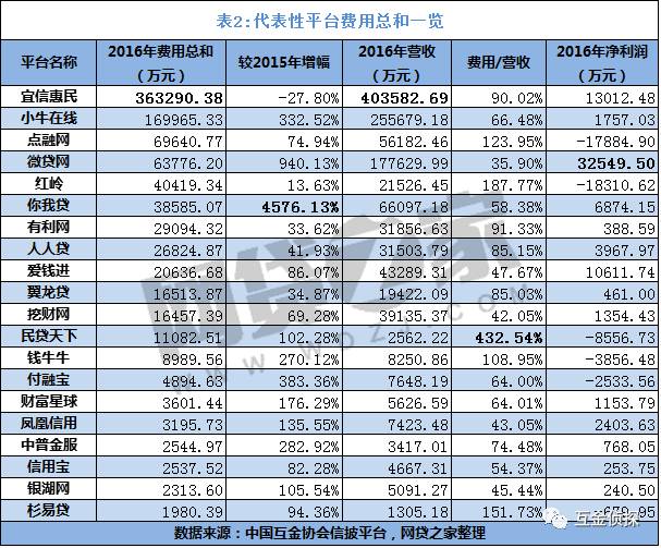 动态来看,除了宜信惠民之外,其余平台2016年的费用类支出较2015年均有明显的上涨,增幅最大的你我贷达到了4576.13%,其三大费用总和为3.86亿元,当年的营收为6.61亿元,净利润6874.15万元。