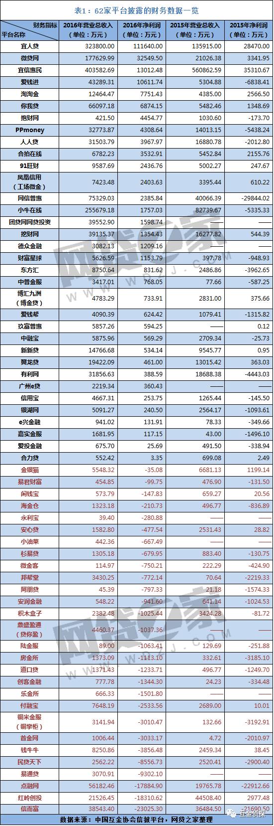 截至2017年8月3日,已有62家平台对接了中国互金协会信披系统,62家平台均上传了包含逾期金额/逾期率在内的运营数据,其中有60家平台(搜易贷、开鑫贷尚未公布财报)披露了2016年的财务报告,网贷之家将宜人贷、信而富一起纳入统计(本文中将重点解析信披系统上60家平台的财务数据),得出表1数据。(详见文末表1:62家平台盈利数据一览)