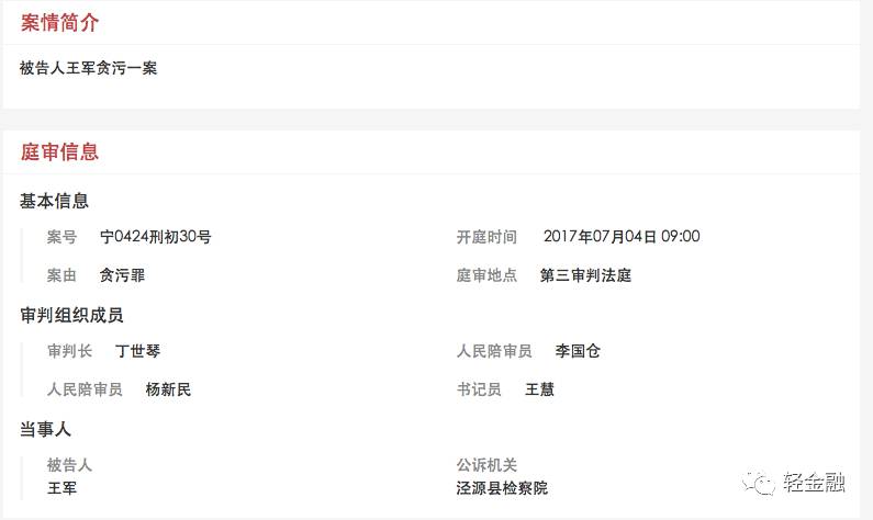 8月4日,宁夏泾源县人民法院公布王军贪污罪一审刑事判决书。