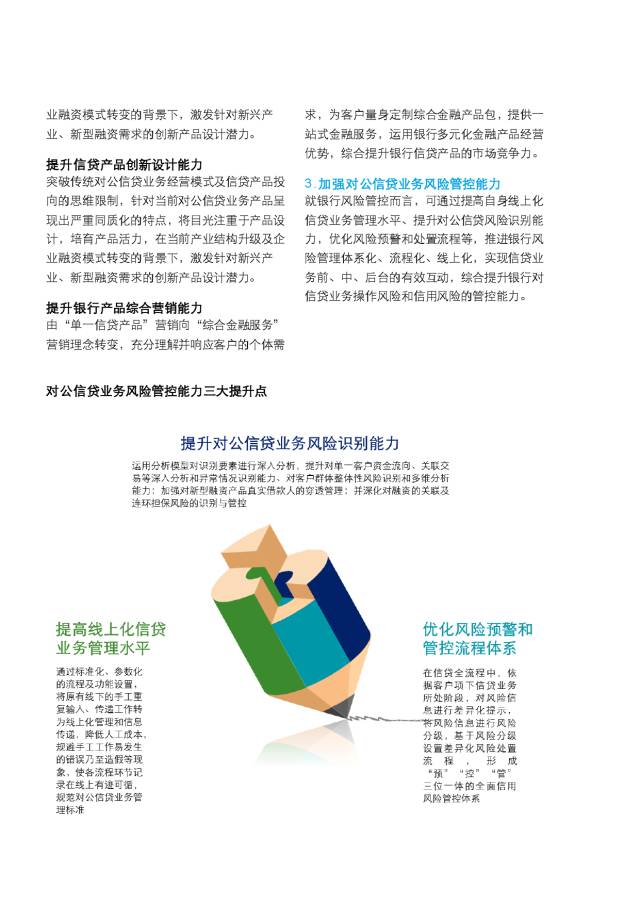 银行对公信贷业务经营管理转型重点提升领域:面对上述银行当前面临的挑战,德勤中国金融行业管理咨询服务团队建议银行应从客户管理、产品创新、对公信贷业务风险管控、及对公信贷业务管理四个方面进行提升,实现信贷业务从粗放化管理向精细化管理转型;