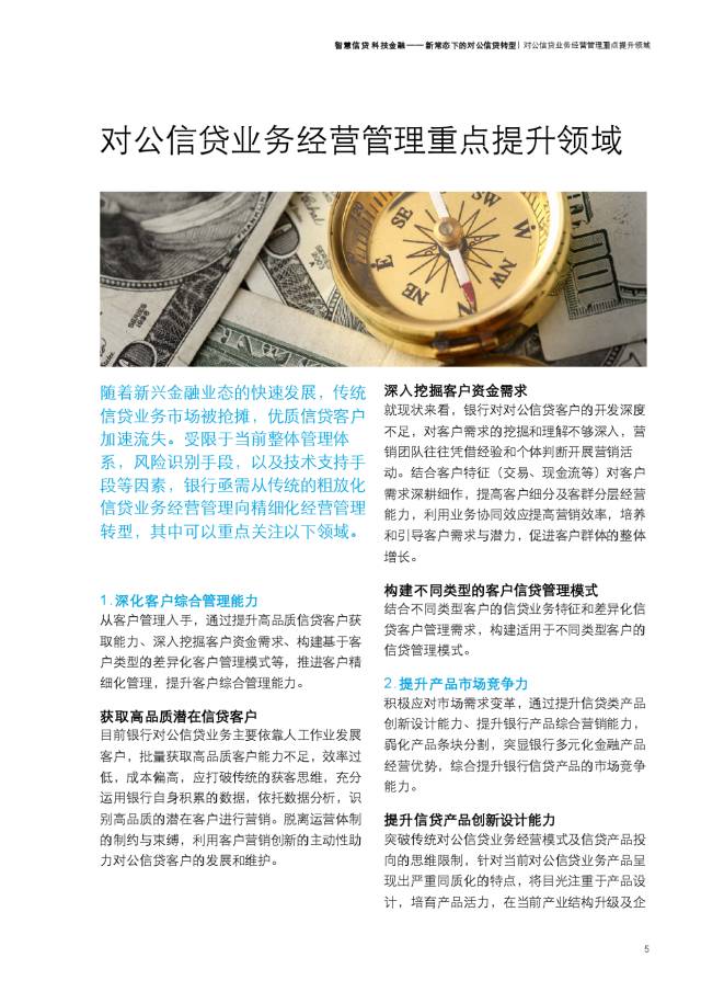 《智慧信贷 科技金融-新常态下的对公信贷转型)报告对银行对公信贷业务经营管理当下面临的主要挑战进行分析,并提出银行对公信贷业务经营管理重点、需提升领域及应对措施,旨在发掘数字化转型相关的潜在机遇,帮助银行应对挑战,实现收益。