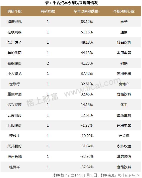 此外,格上研究中心发现,今年以来千合资本参与调研16次,涉及个股15只,其中“鞍钢股份”最受关注,被调研2次。就行业而言,被调研个股多集中在家用电器和食品饮料行业,占比约40%。