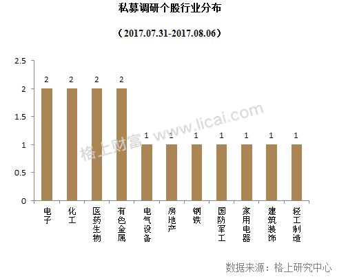 本周中小板关注度最高,为60%,主板和创业板各为20%。在行业方面,本周调研个股所属行业较为分散,电子、化工、医药生物和有色金属受关注相对较高,均有2只个股接受调研。