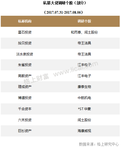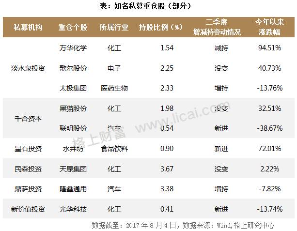 随着上市公司2017年中报的陆续披露,知名私募二季度的投资动向渐渐揭开了面纱。格上研究中心数据显示,截至8月6日,共有244家上市公司发布了2017年中报,在这些公司的前十大流通股东中不乏像淡水泉投资、千合资本、星石投资等知名私募的身影。值得注意的是,今年以来不少私募重仓股表现亮眼,其中淡水泉投资持有的“万华化学”今年以来涨幅超过90%,星石投资持有的“水井坊”今年以来涨幅也超过70%。