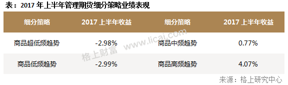 伴随着交易量的回落,2017年上半年,商品市场多数品种结束火爆行情,进入持续震荡下行通,整体趋势并不明显。多个品种出现突涨闪跌,震荡幅度加大,尤其是周度趋势无法持续,这对于市场上大部分程序化期货策略是致命的,容易陷入反复止损的境地。格上研究中心数据显示,2017上半年,程序化期货策略平均收益-2.33%。而市场行情虽然缺乏趋势行情,但整体表现能反应一定的基本面数据,而非完全由资金驱动,所以导致主观期货策略虽未获得正收益,但表现优于程序化期货。格上研究中心数据显示,2017上半年,主观期货策略平均收益为-0.77%。