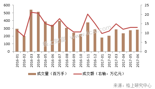 回顾整个商品期货市场,格上研究中心发现,自去年11月份以后,市场交易量趋降。2017年平均月度成交量为2.44亿手,较2016年下降28.82%;月均成交额为12.22万亿元,较去年缩减17.24%。