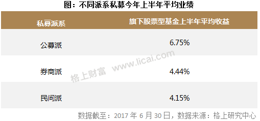 格上研究中心数据显示,截至2017年6月30日,公募派的基金经理旗下产品平均收益达6.75%,是私募行业上半年收益(3.49%)的近2倍,同时也高于券商派平均收益4.44%和民间派平均收益4.15%。
