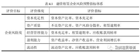 根据上文对融资租赁风险类型、风险形成原因的分析,并通过对风险预警指标的选择,提炼出融资租赁企业风险预警指标体系: