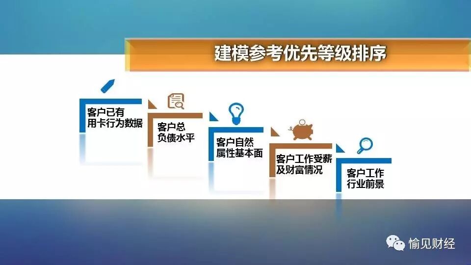 从最优开始排列,依次为客户已有用卡行为数据、客户总负债水平、客户自然属性基本面、客户工作受薪及财富情况、客户工作行业前景等。其中无征信参考、或没有丰富历史用卡行为数据的客户,银行会更多依赖此排序中的后三类信息;而对于该行存量客户,则更依赖前两项及客户在该行既有业务使用信息。