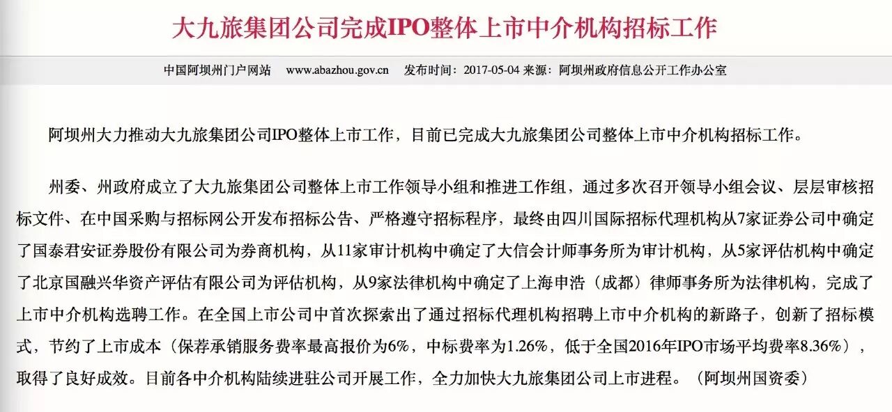 阿坝州政府网站披露的大九旅集团公司IPO进展: