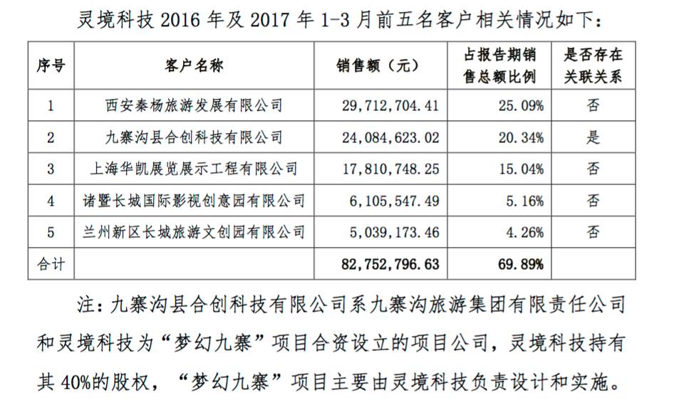 根据公司对深交所的回复,灵境科技2016年及2017年1-3月前五名客户中,九寨沟县合创科技有限公司以2408.46万元的销售额成为第二大客户。九寨沟县合创科技有限公司系九寨沟旅游集团有限责任公司和灵境科技为“梦幻九寨”项目合资设立的项目公司,灵境科技持有其40%的股权,“梦幻九寨”项目主要由灵境科技负责设计和实施。