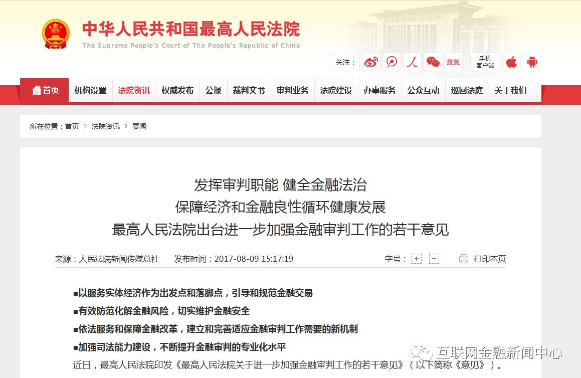 来源:互联网金融新闻中心《意见》对互联网金融问题给予了高度的关注。近日,最高人民法院印发《最高人民法院关于进一步加强金融审判工作的若