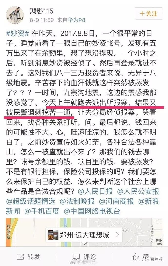 高管团队连续换血再加上已经几天没来上班、客服电话打不通的情况,很难判断妙资金融是真的经侦雷还是早有跑路的预谋,不过有投资人称,公安盯了妙资很久了,有非法集资嫌疑,涉及到非法操作。