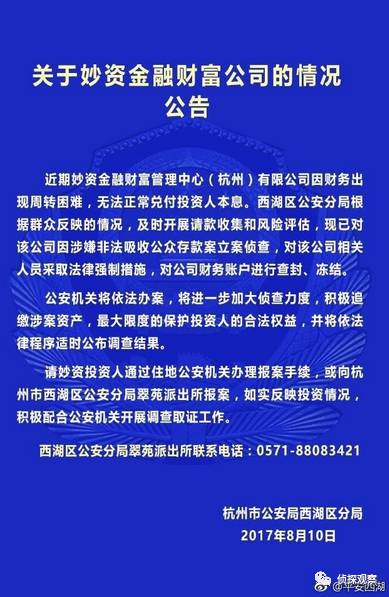 据杭州市公安局西湖区分局微博“平安西湖”发布,目前公安机关已经对公司涉嫌非法吸收公众存款进行立案侦查,建议投资人到住地公安机关报案。