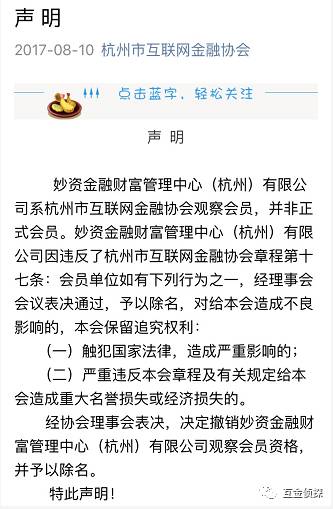 而今日,认证主体为“杭州市互联网金融协会”的微信公众号发布声明,称妙资金融只是杭州互金协会的观察会员,并非正式会员。现因违反协会章程,经理事会会议表决,撤销其观察会员资格,并予以除名。