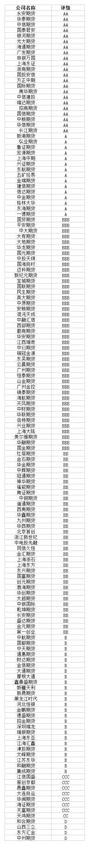 结合去年的情况相比,去年被评为AA级公司的10家期货公司,今年仍坐稳AA级。而国信期货、海通期货、国泰君安、上海东证、浙商期货、中信期货、国际期货、华信期货(华信万达)、华泰期货、南华期货、瑞达期货、长江期货等12家期货公司今年则从不同级别升至AA级。