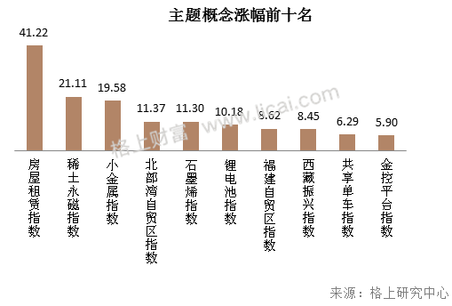 主题概念方面,受广州推出租售同权的消息提振,房屋租赁概念指数本月涨幅最大,上涨41.22%;在大批有色金属原材料涨价的趋势推动下,稀土、小金属概念股集体走高,稀土永磁概念股平均上涨21.11%,小金属概念股上涨19.58%。此外,与新能源汽车电池相关的锂电池概念股和石墨烯概念股也有较大幅度的上涨。