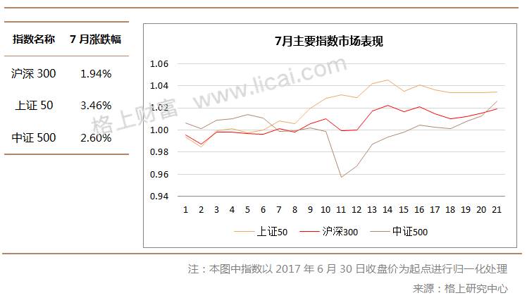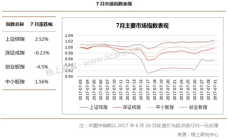 2017年7月,A股市场整体上涨,上证50依旧保持强劲上涨态势,上涨3.46%,与此同时,创业板出现大幅下跌,本月下跌4.5%。其他指数整体走势良好,本月沪深300上涨1.94%;上证综指上涨2.52%,深证成指下跌0.23%,中小板指上涨1.56%,中证500上涨2.6%。下面,格上研究中心将从两市表现、主题热点、市场活跃度、资金流向、市场估值等角度对市场进行分析。