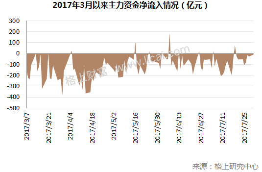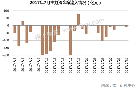通过观察2017年3月以来主力资金的整体动向,我们发现,主力资金仍然呈净流出状态,截至7月末,2017年日均主力净流出额为118.7亿元,总净流出额为11874亿元。